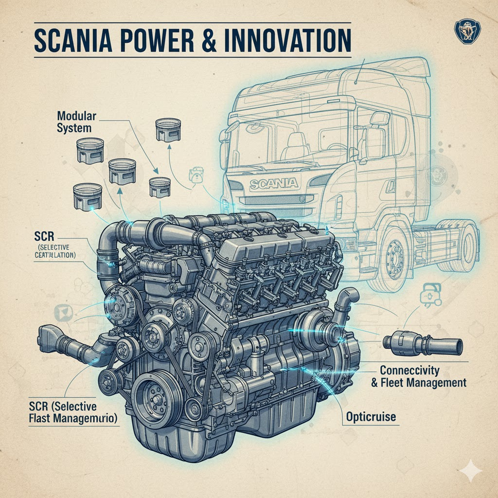 Scania terkenal dengan mesin diesel efisiensi tinggi, termasuk mesin V8 legendaris yang menjadi favorit di Eropa.