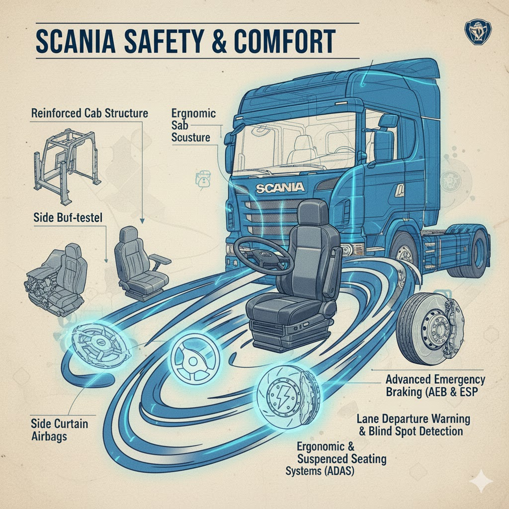 Scania sangat memperhatikan keselamatan pengemudi dan pengguna jalan. Fitur keselamatan meliputi: