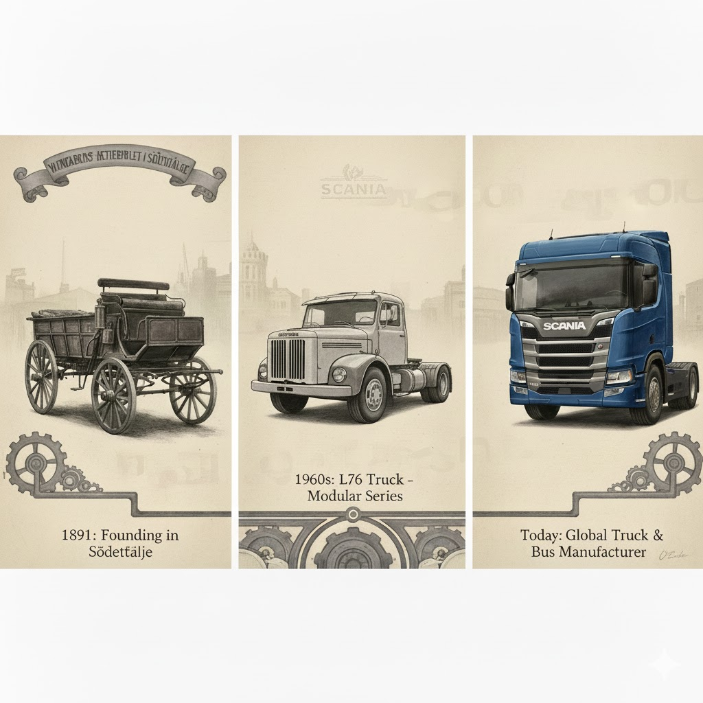 Scania didirikan pada akhir abad ke-19 dan memiliki sejarah panjang dalam pengembangan kendaraan komersial. Sejak awal, Scania fokus pada rekayasa mesin berkualitas tinggi dan desain modular, yang membuat truknya mudah disesuaikan dengan berbagai kebutuhan operasional.